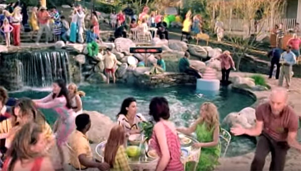 A primera vista, no es gran cosa: Una fiesta en un jardín con piscina y una multitud de gente haciendo diferentes actividades en una toma panorámica. Lo interesante es que son 20 segundos de grabación, que van de adelante-para-atrás-para-adelante enfocándose en secciones específicas de la toma general. La mejor manera de explicarlo es mostrándolo… he aquí:
