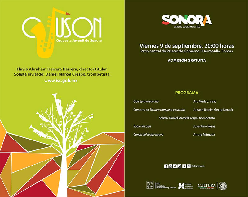 La Orquesta Juvenil de Sonora, bajo la dirección titular de Flavio Abraham Herrera Herrera, se une en concierto a Daniel Marcel Crespo, trompetista invitado; el programa estará compuesto por piezas de Merle J. Isaac, Johann Baptist Georg Neruda, Juventino Rosas y del sonorense Arturo Márquez.