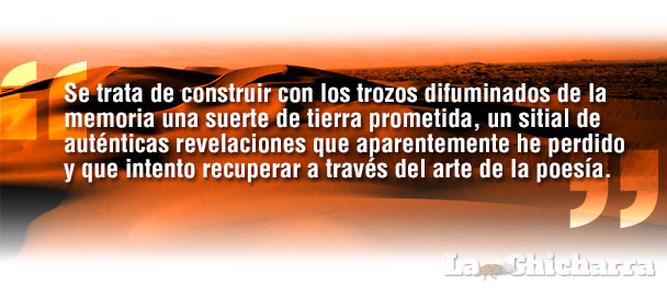 Con el desierto tengo una relación que se ha ennoblecido en la distancia. Me gusta volver a él de cuando en cuando, visitarlo para tocarlo y hollarlo, para confirmar que sigue siendo una realidad en algún lado y no solamente los vapores del recuerdo o la ensoñación. Luego vuelvo a partir y dejo que sea la imaginación quien lo reconstruya, quien le dé atributos exagerados o francamente imposibles, y eso me hace sentir muy bien: me invento -sin que nadie lo sepa- una nostalgia. Se trata de construir con los trozos difuminados de la memoria una suerte de tierra prometida, un sitial de auténticas revelaciones que aparentemente he perdido y que intento recuperar a través del arte de la poesía. Me ayudan mucho también las letras de autores como Bowden, Harrison, Abbey o el mismo Merthon, que alguna tarde me enseñó en uno de sus versos cómo y por qué Dios le había dado al diablo el desierto como hogar. Pienso también en Borges, cuyo desierto, imaginado y laberíntico, era la prisión más perfecta que jamás nadie hubiera urdido.