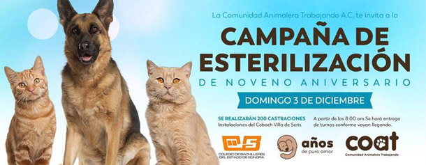 Con motivo del 9no Aniversario de COAT Comunidad Animalera Trabajando A.C., llevaremos a cabo una campaña GRATUITA de esterilización de mascotas, dirigida principalmente a los sectores vulnerables de la población.